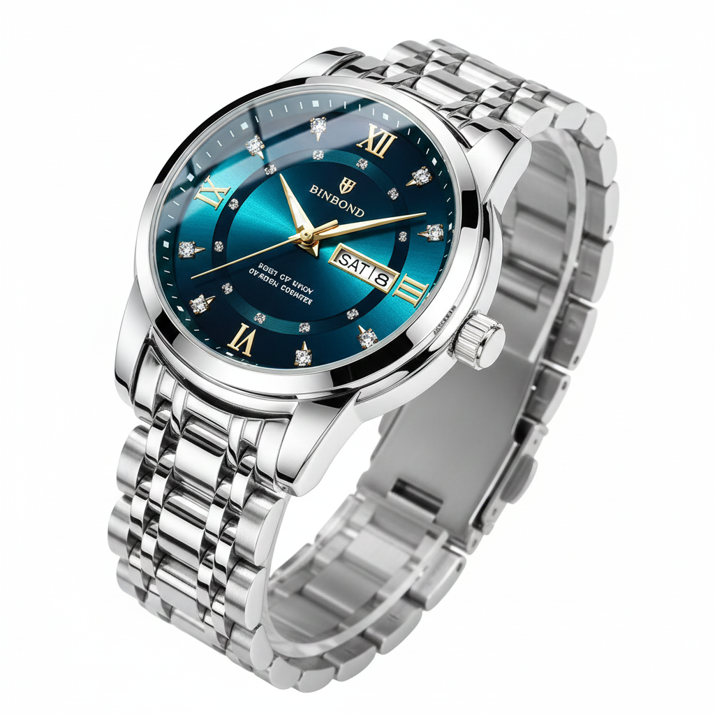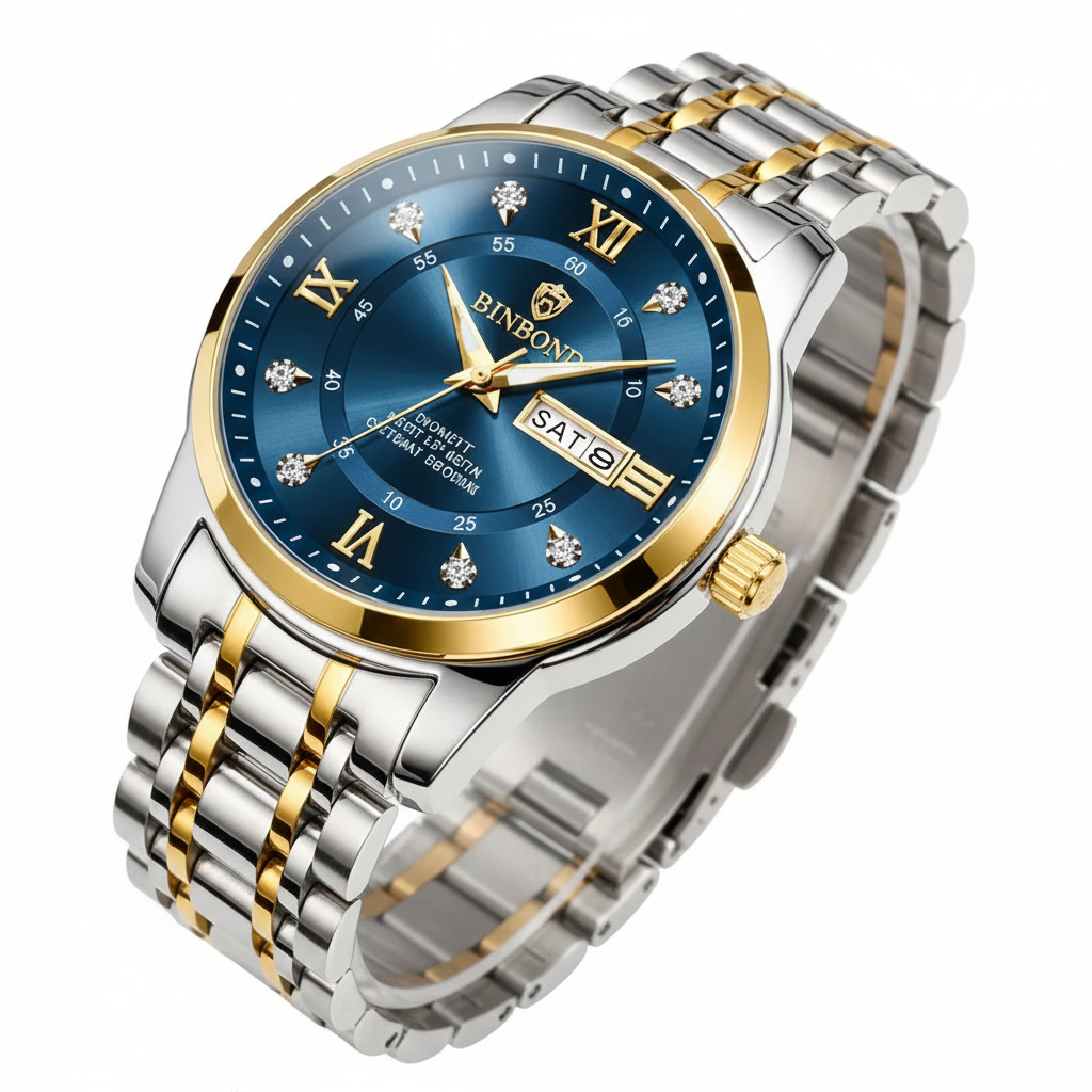 Men's quartz wristwatch, gold and diamond, elegant watch.